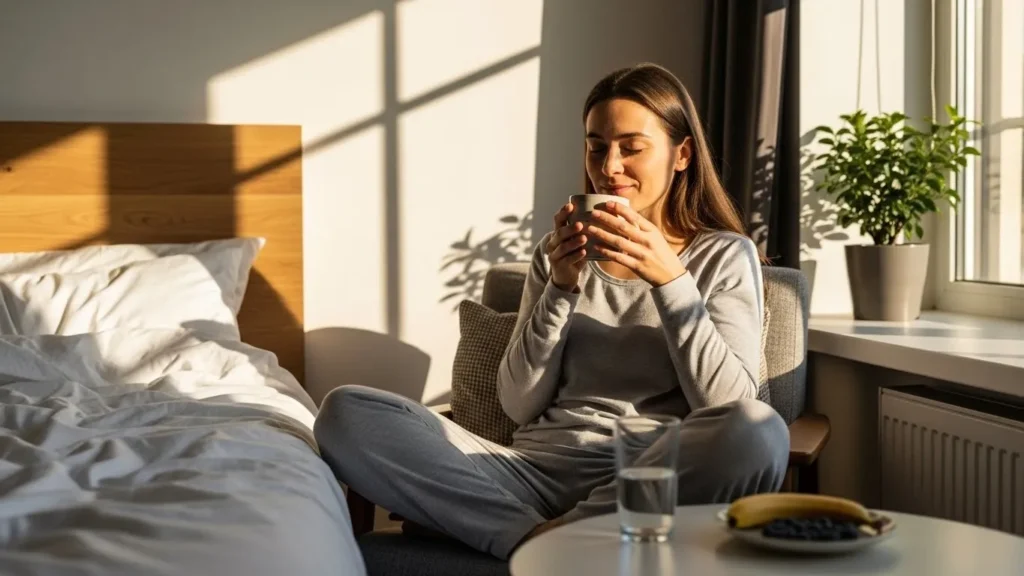 Waking up time is often the most important anchor. Choosing a consistent wake-up time helps regulate the entire sleep-wake cycle, even more than bedtime does. When you wake up at the same time every day, the body gradually adjusts sleep pressure and melatonin release to support falling asleep more easily at night. Over time, bedtime naturally shifts into a healthier range without force.
